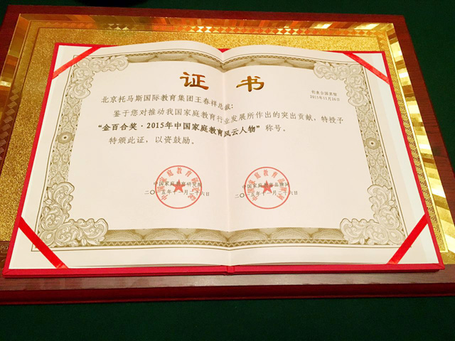 2015年11月26日,托马斯教育在第八届新浪教育盛典上蝉联“中国投资价值教育连锁机构”,并荣获首届中国家庭教育金百合双奖“2015年中国家庭教育创新先进单位奖”和“金百合中国家庭教育创新风云人物奖”!