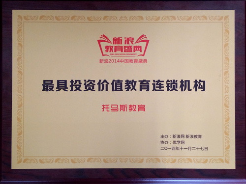 11月27日,经过云集中国教育界权威的评委会慎重评选和网络投票,托马斯教育机构脱颖而出,连获“2014年度投资价值教育连锁机构”和“2014年度品牌影响力儿童教育机构”两项重磅大奖。